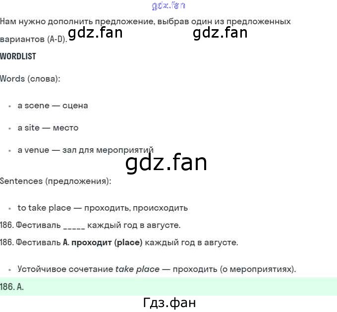 Проверка домашнего задания всегда занимает большое количество времени. На помощь приходит ГДЗ фан по Английскому языку десятого класса. Здесь собраны популярные ответы на 186 (стр. 89) Английский язык 10 класс рабочая тетрадь Starlight Баранова К.М.