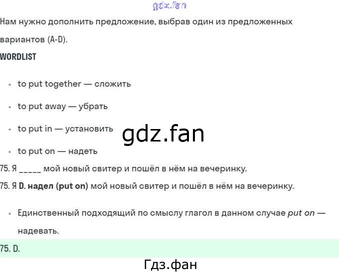 Проверка домашнего задания всегда занимает большое количество времени. На помощь приходит ГДЗ фан по Английскому языку десятого класса. Здесь собраны популярные ответы на 75 (стр. 85) Английский язык 10 класс рабочая тетрадь Starlight Баранова К.М.
