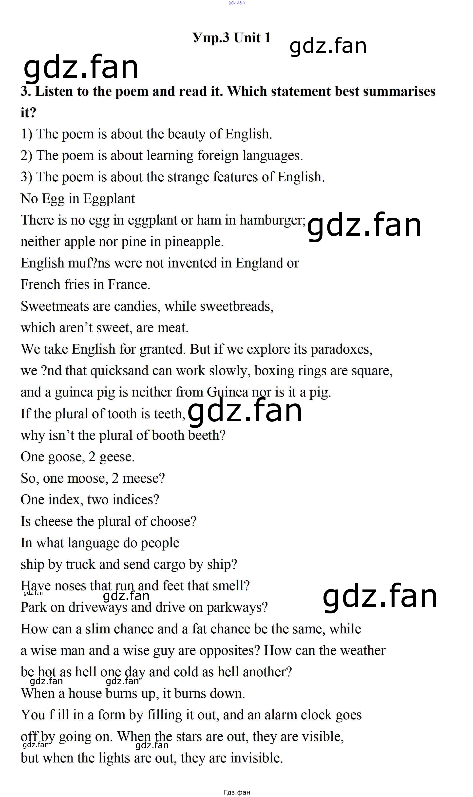 Проверка домашнего задания всегда занимает большое количество времени. На помощь приходит ГДЗ фан по Английскому языку одиннадцатого класса. Здесь собраны популярные ответы на 3 (стр. 9) Английский язык 11 класс Биболетова