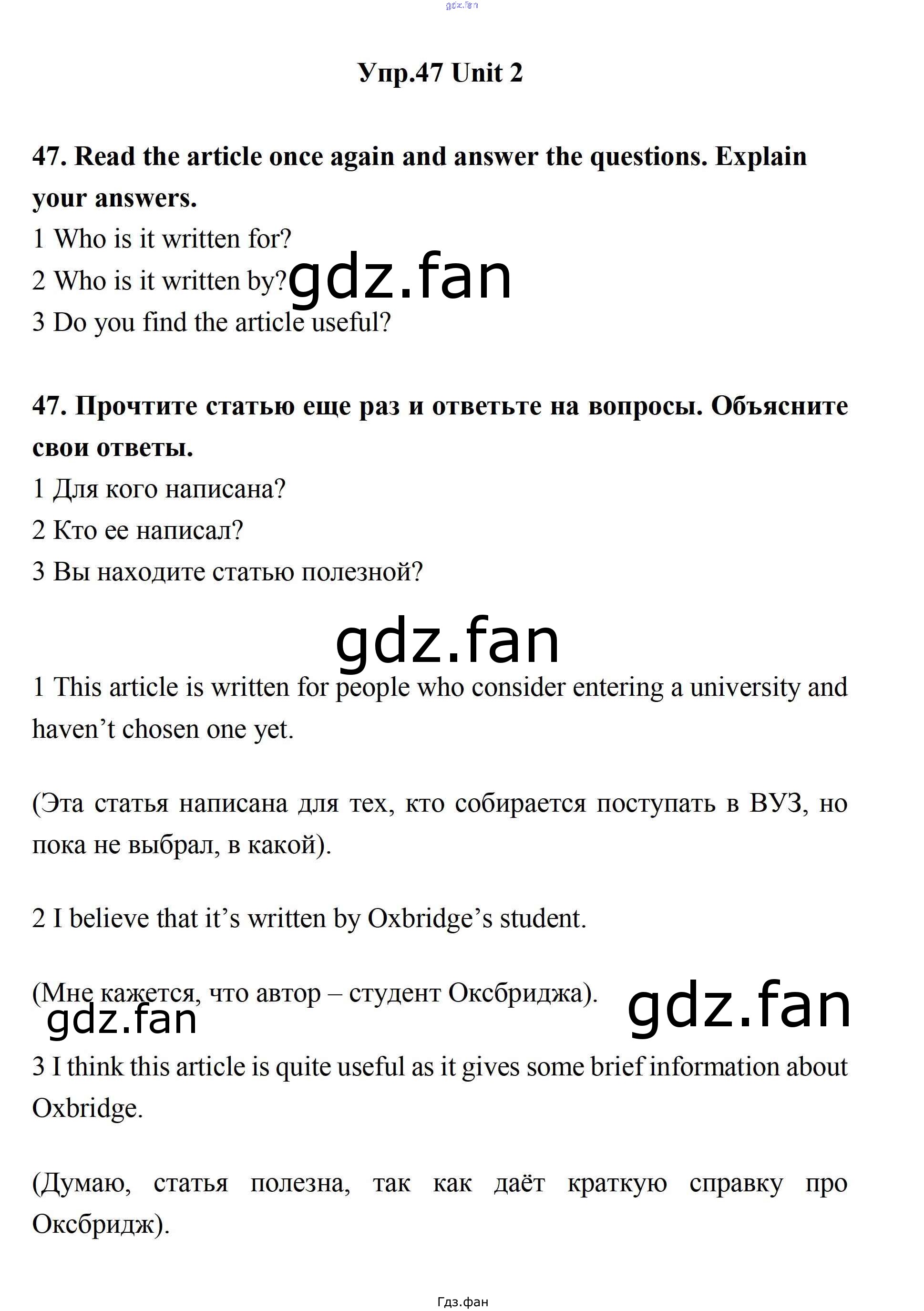 Проверка домашнего задания всегда занимает большое количество времени. На помощь приходит ГДЗ фан по Английскому языку одиннадцатого класса. Здесь собраны популярные ответы на 47 (стр. 63) Английский язык 11 класс Биболетова