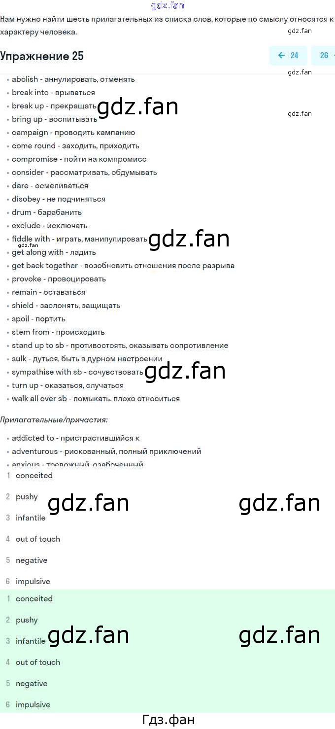 Проверка домашнего задания всегда занимает большое количество времени. На помощь приходит ГДЗ фан по Английскому языку одиннадцатого класса. Здесь собраны популярные ответы на 25 (стр. 10) Английский язык 11 класс рабочая тетрадь Вербицкая М.В.