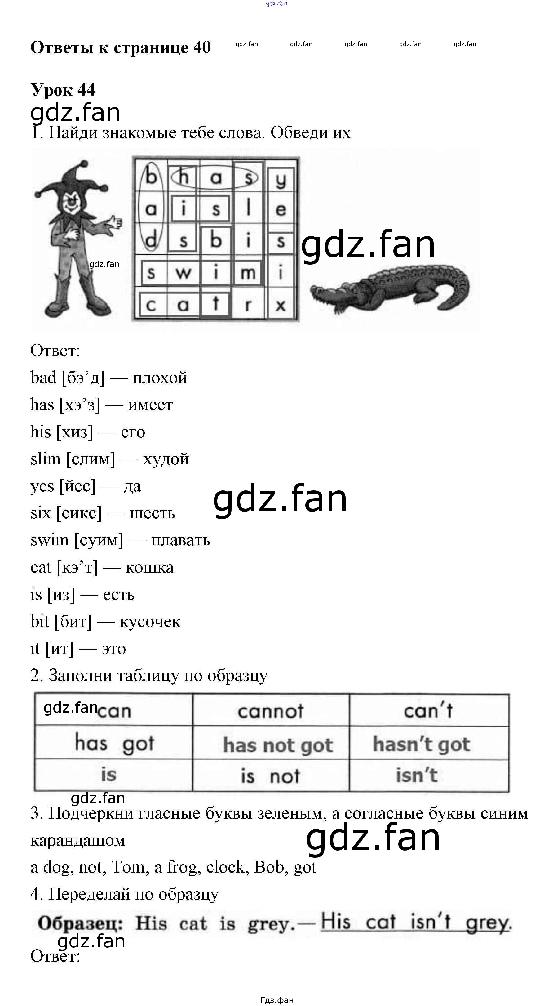 Проверка домашнего задания всегда занимает большое количество времени. На помощь приходит ГДЗ фан по Английскому языку второго класса. Здесь собраны популярные ответы на 40 Урок (Урок 44 № 1, 2, 3, 4, 5) Английский язык 2 класс рабочая тетрадь Биболетова Enjoy English