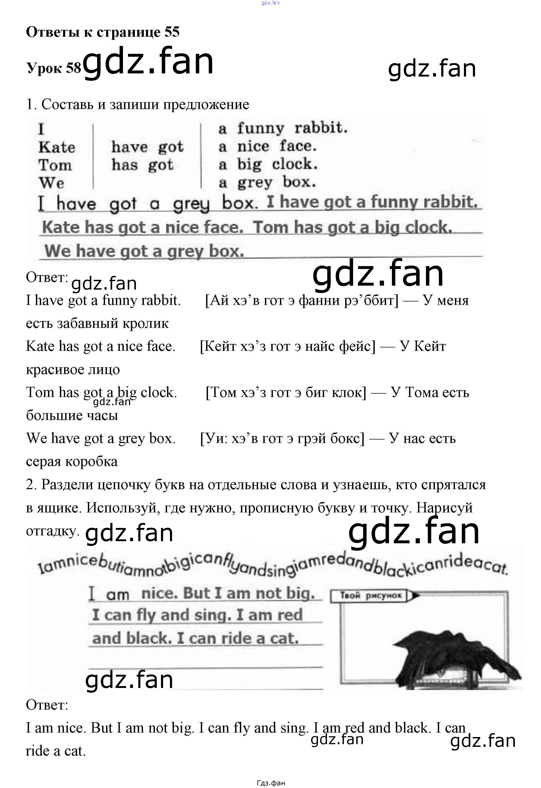 Проверка домашнего задания всегда занимает большое количество времени. На помощь приходит ГДЗ фан по Английскому языку второго класса. Здесь собраны популярные ответы на 55 (Урок 58 № 1, 2, 3, 4) Английский язык 2 класс рабочая тетрадь Биболетова Enjoy English