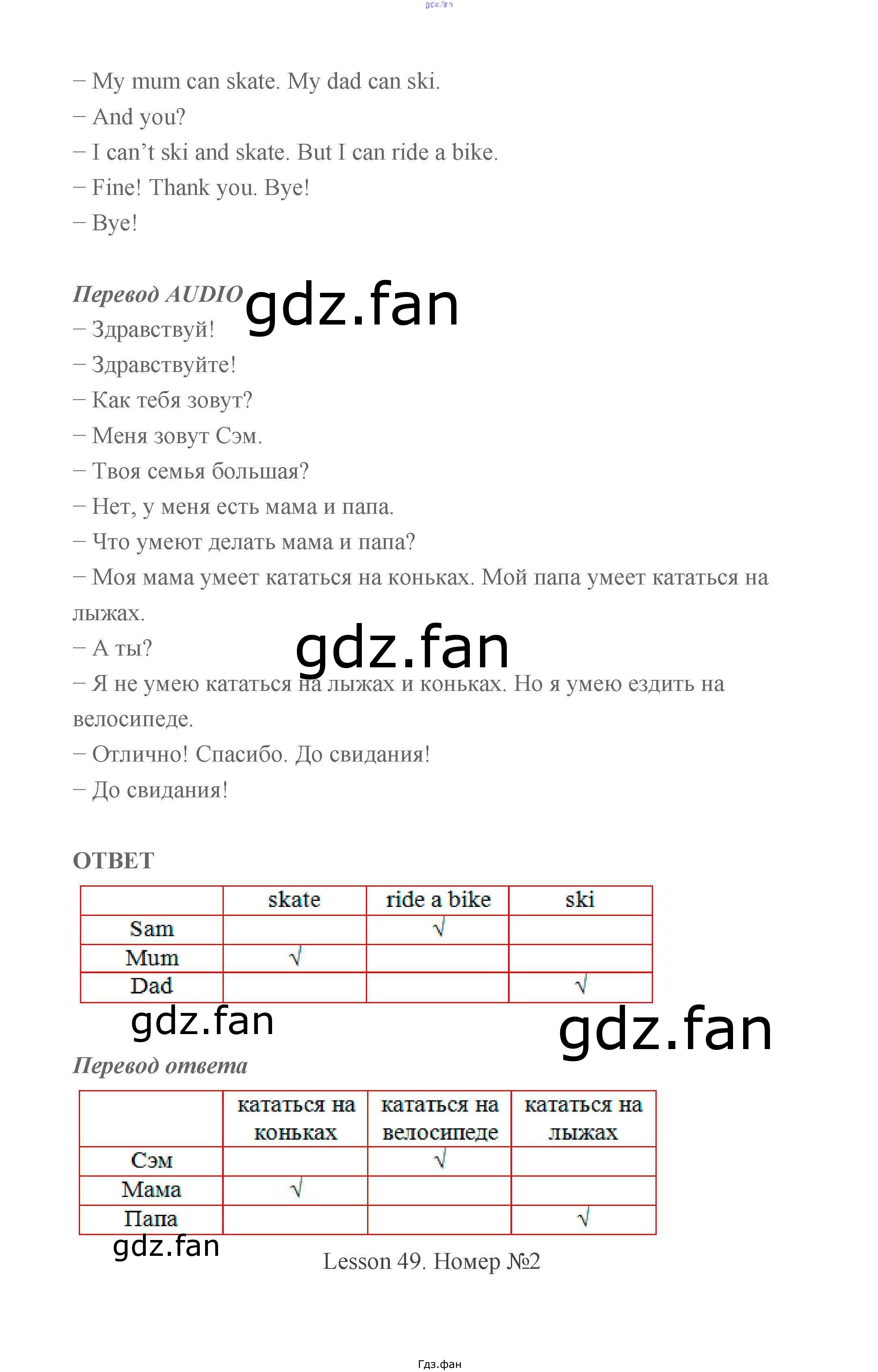 Проверка домашнего задания всегда занимает большое количество времени. На помощь приходит ГДЗ фан по Английскому языку второго класса. Здесь собраны популярные ответы на 96 (Lesson 49 № 1, 2, 3) Английский язык 2 класс Биболетова Enjoy English