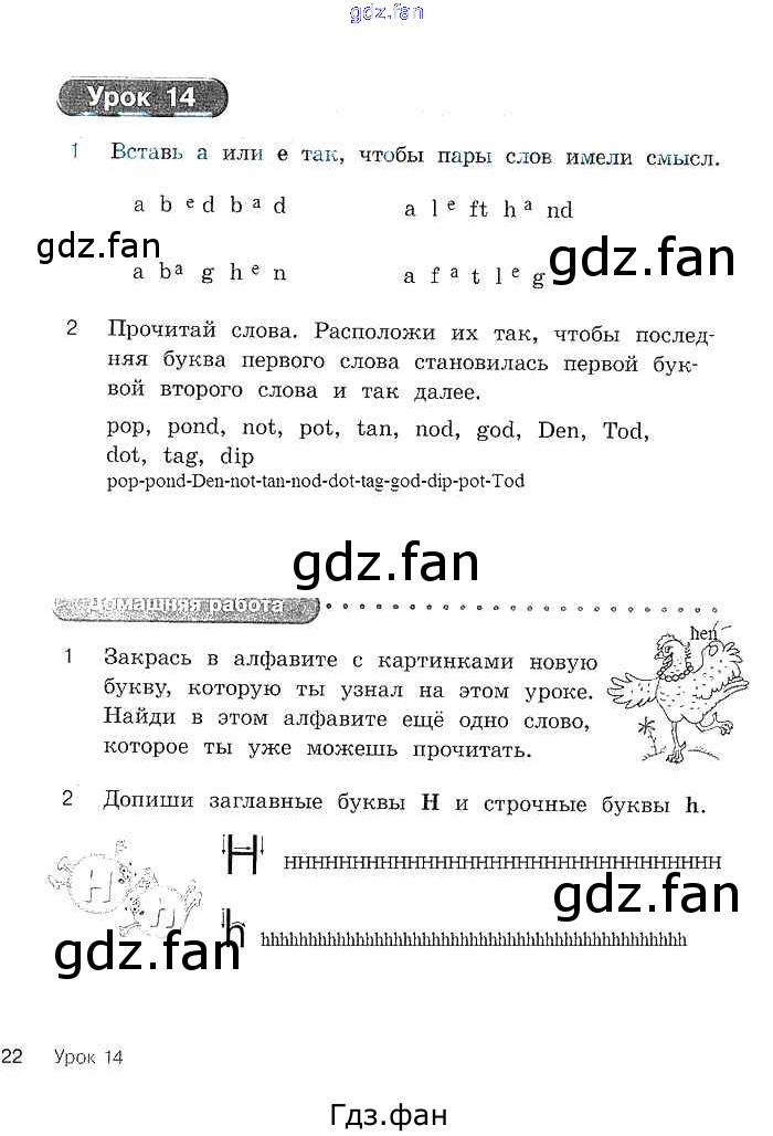 Проверка домашнего задания всегда занимает большое количество времени. На помощь приходит ГДЗ фан по Английскому языку второго класса. Здесь собраны популярные ответы на 22 (Урок 14 № 1, 2. Домашняя работа № 1, 2) Английский язык 2 класс рабочая тетрадь Кауфман