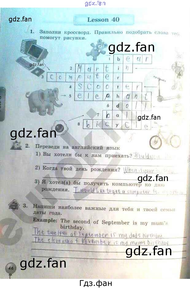 Проверка домашнего задания всегда занимает большое количество времени. На помощь приходит ГДЗ фан по Английскому языку третьего класса. Здесь собраны популярные ответы на 46 (Lesson 40 № 1, 2, 3) Английский язык 3 класс рабочая тетрадь Биболетова