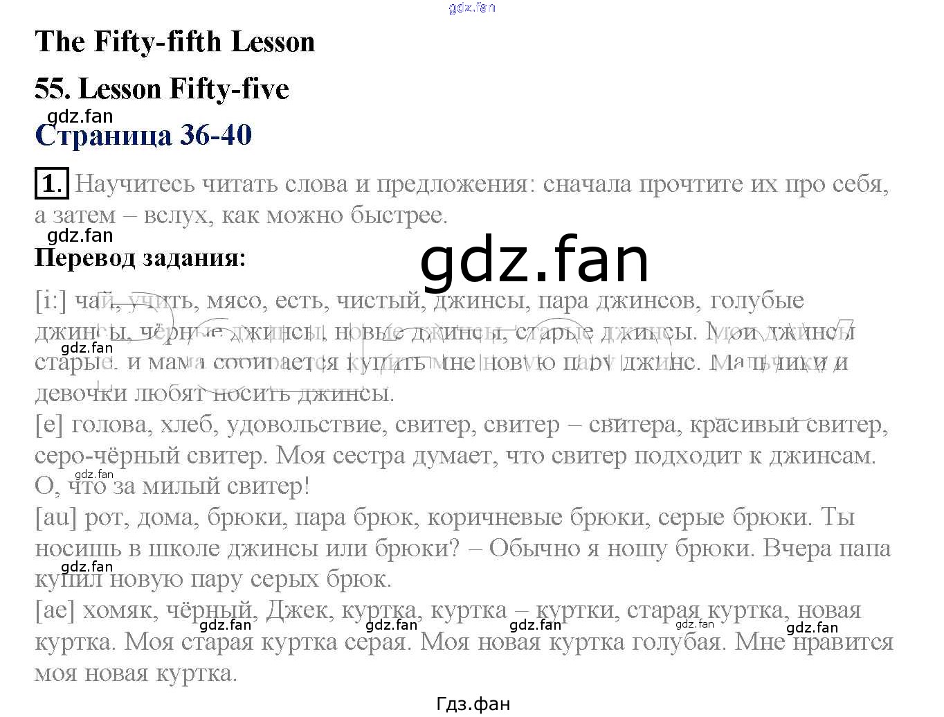 Проверка домашнего задания всегда занимает большое количество времени. На помощь приходит ГДЗ фан по Английскому языку третьего класса. Здесь собраны популярные ответы на 36 (Lesson 55 № 1, 2) Английский язык 3 класс Верещагина