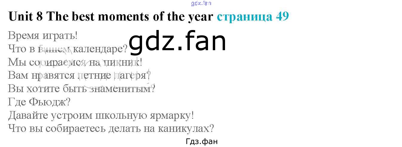 Проверка домашнего задания всегда занимает большое количество времени. На помощь приходит ГДЗ фан по Английскому языку четвертого класса. Здесь собраны популярные ответы на Вступление (стр. 49) Английский язык 4 класс Кузовлев В.П.
