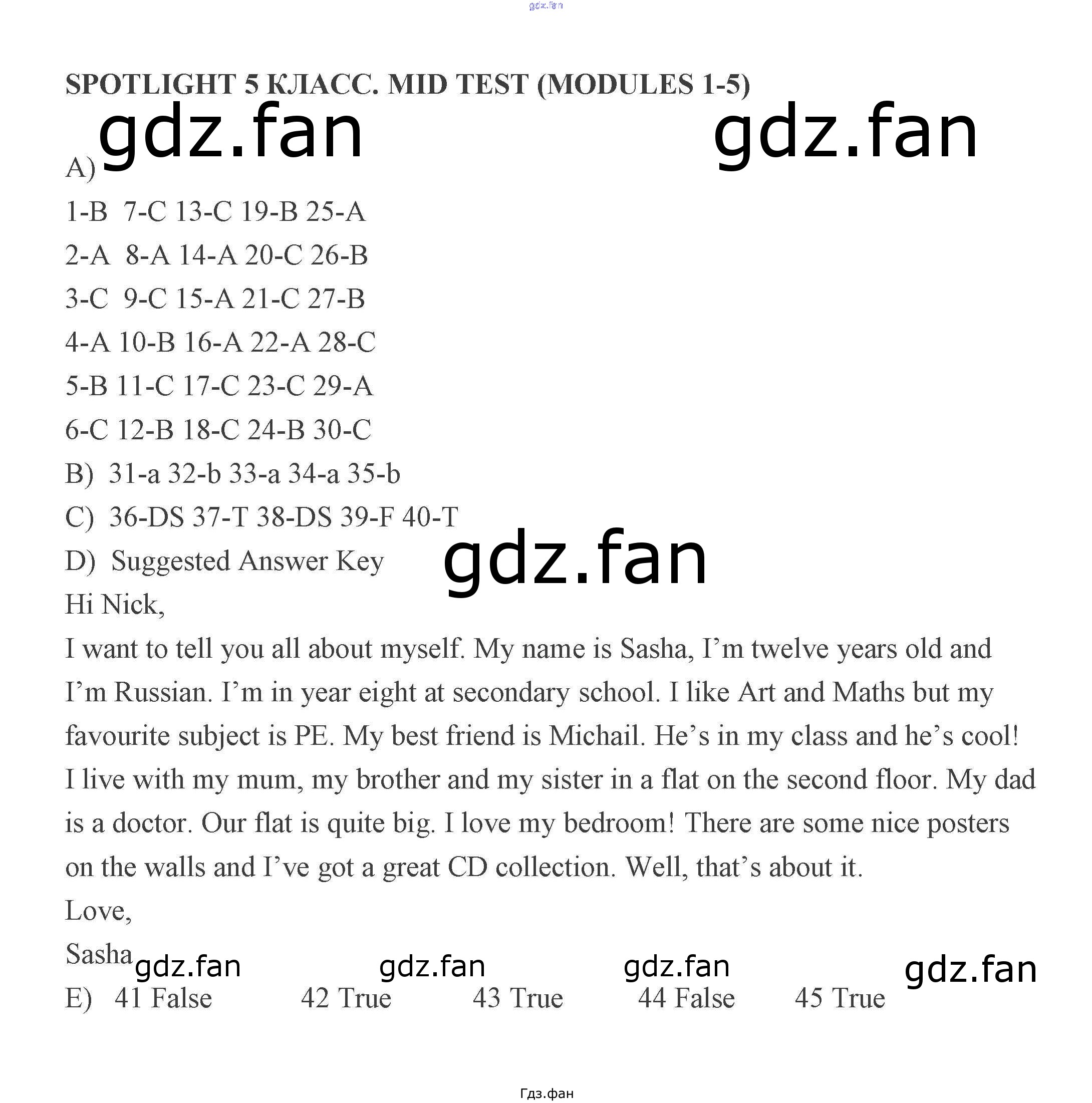 Проверка домашнего задания всегда занимает большое количество времени. На помощь приходит ГДЗ фан по Английскому языку пятого класса. Здесь собраны популярные ответы на Mid test (стр. 45-47) Английский язык 5 класс контрольные задания Ваулина Spotlight