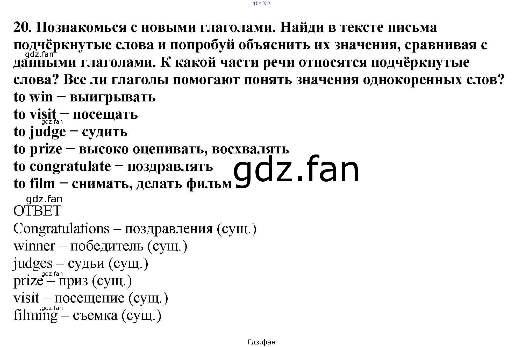 Проверка домашнего задания всегда занимает большое количество времени. На помощь приходит ГДЗ фан по Английскому языку пятого класса. Здесь собраны популярные ответы на 20 (стр. 19) Английский язык 5 класс Вербицкая М.В.