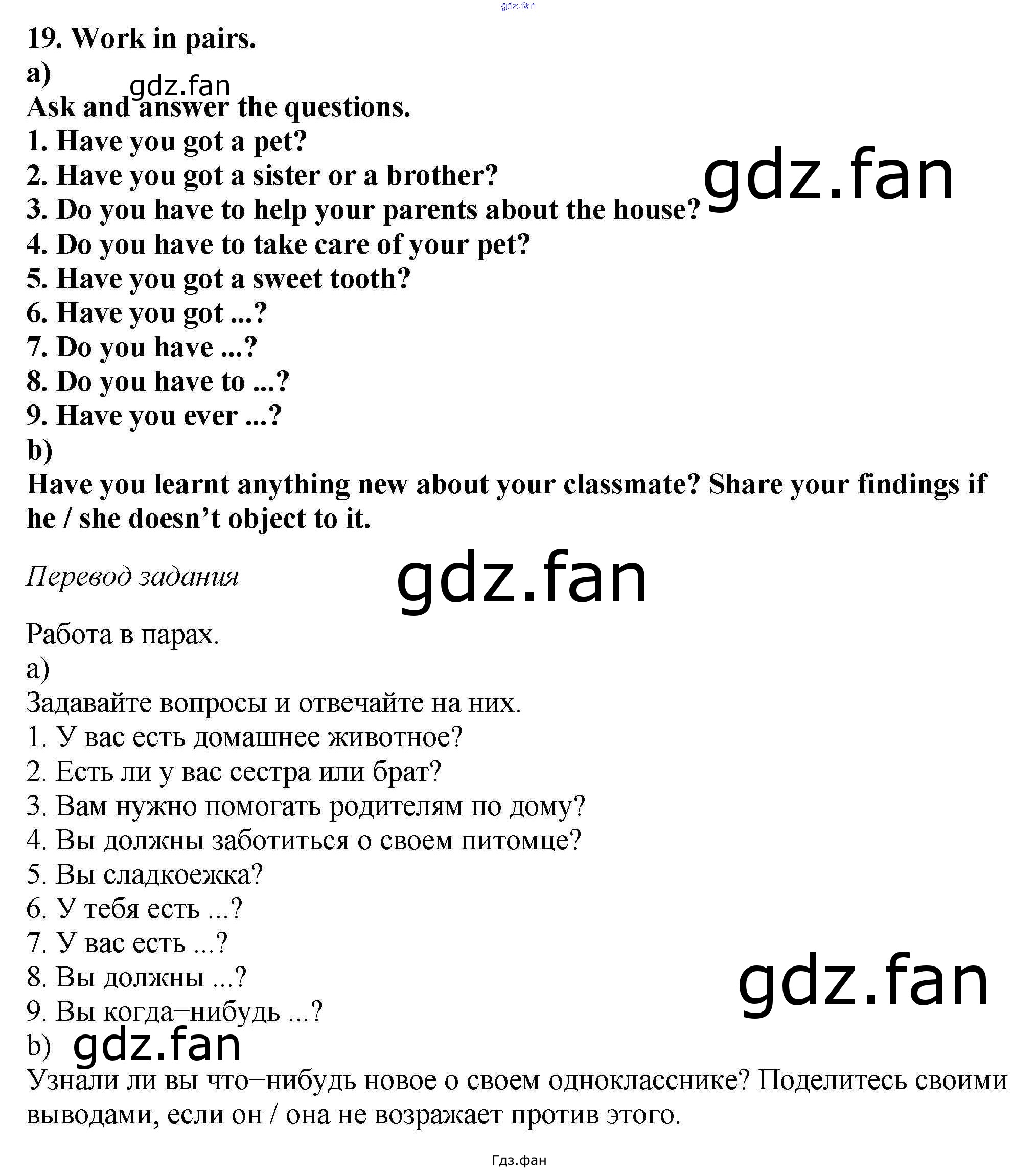 Проверка домашнего задания всегда занимает большое количество времени. На помощь приходит ГДЗ фан по Английскому языку шестого класса. Здесь собраны популярные ответы на 19 (стр. 54) Английский язык 6 класс Enjoy English Биболетова М.З.