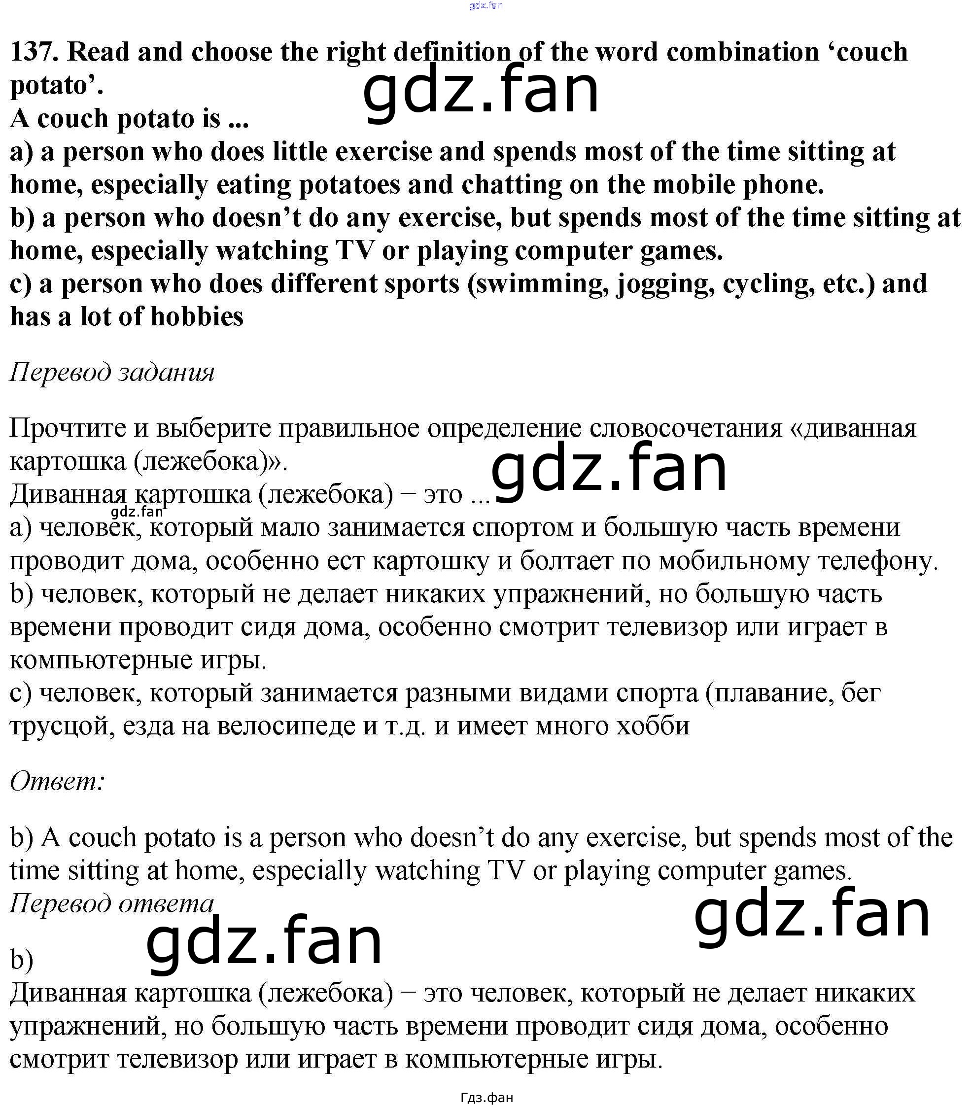 Проверка домашнего задания всегда занимает большое количество времени. На помощь приходит ГДЗ фан по Английскому языку шестого класса. Здесь собраны популярные ответы на 137 (стр. 125) Английский язык 6 класс Enjoy English Биболетова М.З.