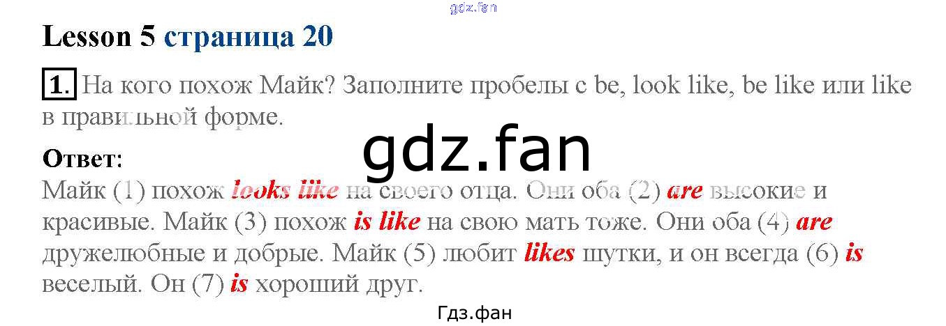 Проверка домашнего задания всегда занимает большое количество времени. На помощь приходит ГДЗ фан по Английскому языку шестого класса. Здесь собраны популярные ответы на 20 (№ 4. Lesson 5 № 1) Английский язык 6 класс рабочая тетрадь Кузовлёв