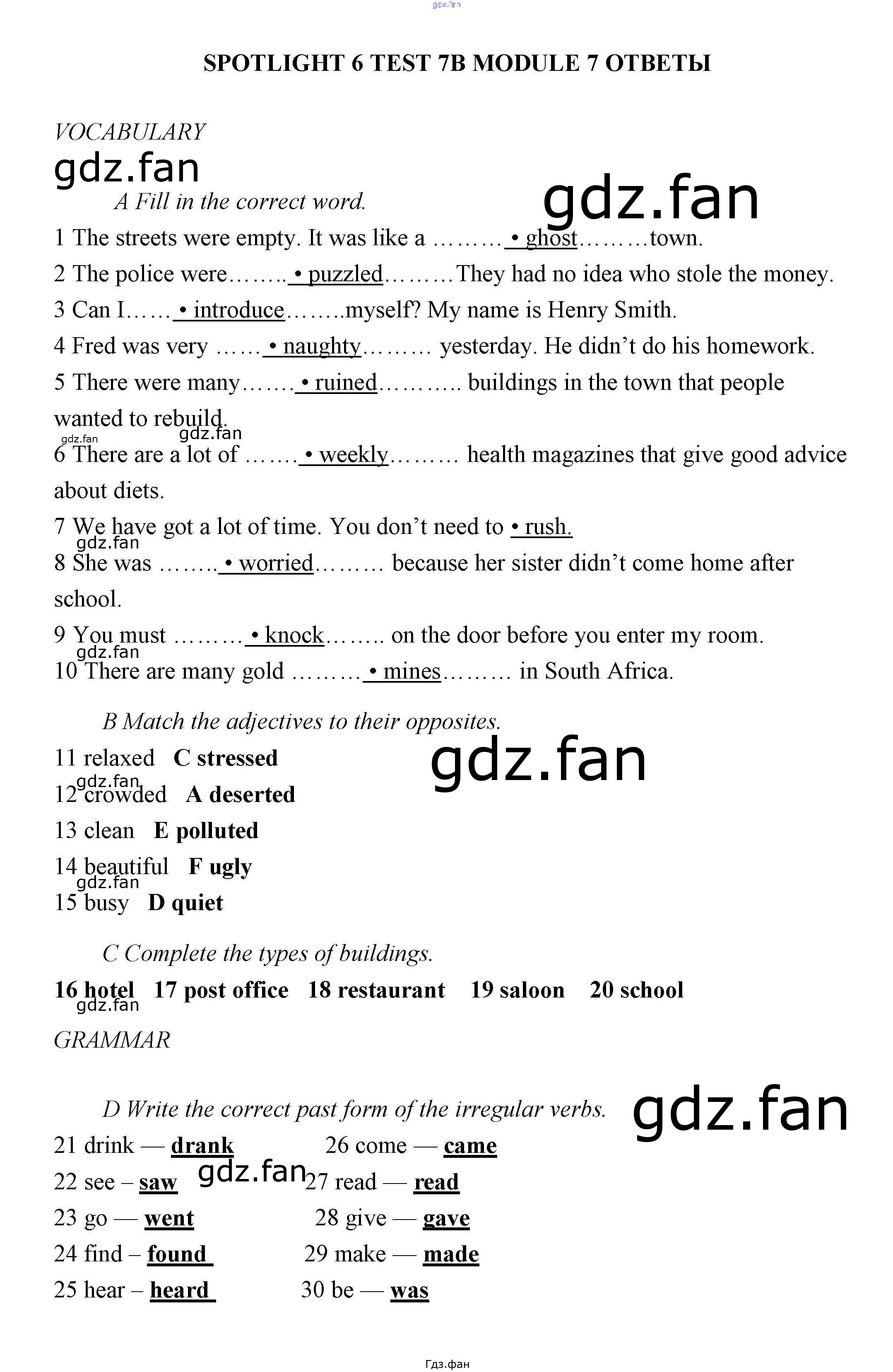 Проверка домашнего задания всегда занимает большое количество времени. На помощь приходит ГДЗ фан по Английскому языку шестого класса. Здесь собраны популярные ответы на 7В (стр. 58-61) Английский язык 6 класс контрольные задания Ваулина Spotlight
