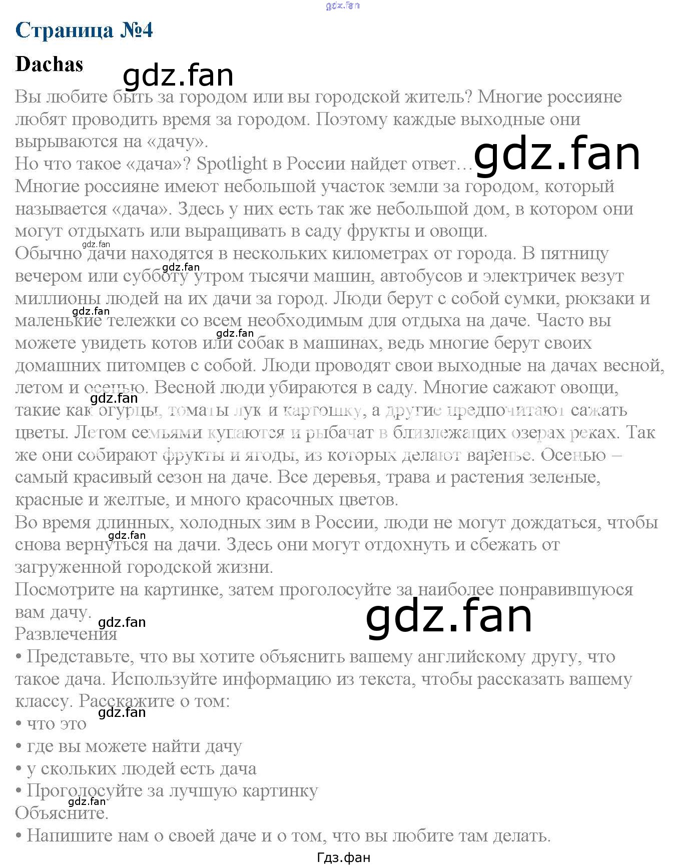 Проверка домашнего задания всегда занимает большое количество времени. На помощь приходит ГДЗ фан по Английскому языку шестого класса. Здесь собраны популярные ответы на Dachas (стр. 4) Английский язык 6 класс Spotlight Ваулина Е.