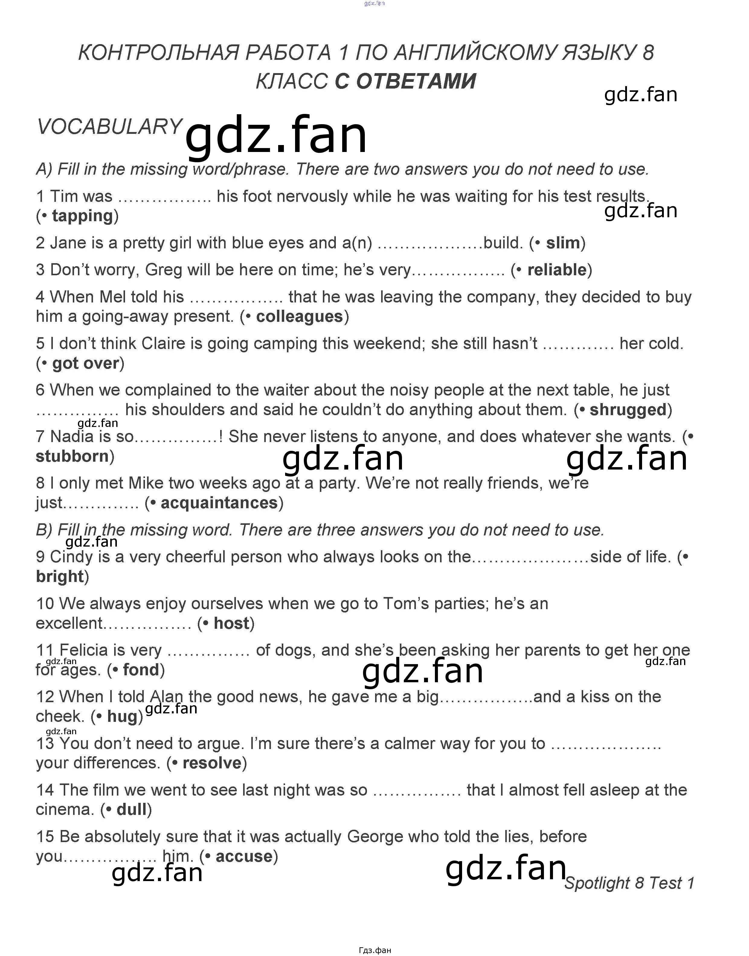 Проверка домашнего задания всегда занимает большое количество времени. На помощь приходит ГДЗ фан по Английскому языку восьмого класса. Здесь собраны популярные ответы на A, B (стр. 9) Английский язык 8 класс контрольные задания Ваулина Spotlight