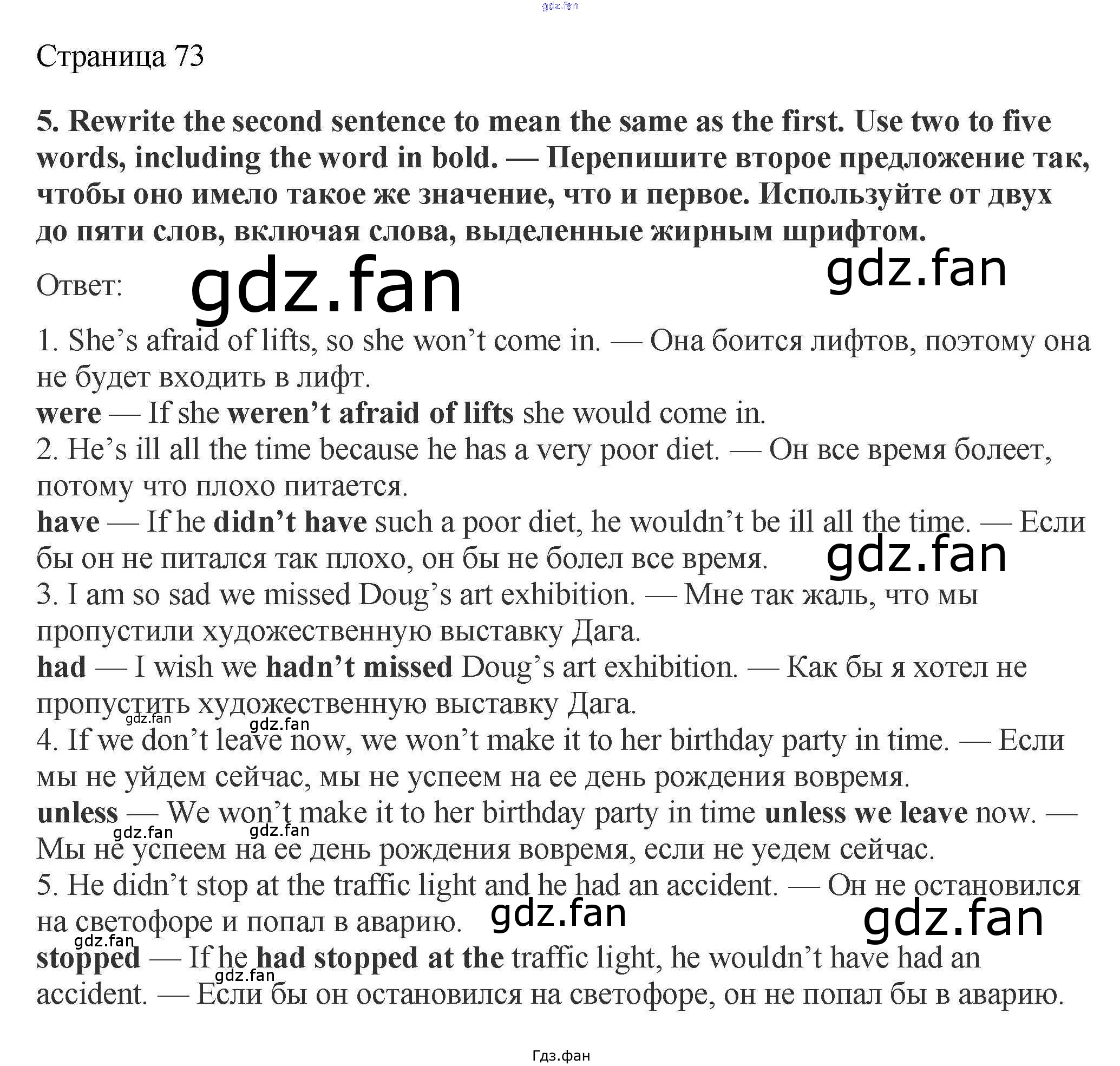 Проверка домашнего задания всегда занимает большое количество времени. На помощь приходит ГДЗ фан по Английскому языку девятого класса. Здесь собраны популярные ответы на 5 (стр. 73) Английский язык 9 класс рабочая тетрадь Spotlight Ваулина
