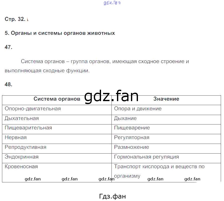 Проверка домашнего задания всегда занимает большое количество времени. На помощь приходит ГДЗ фан по Биологии шестого класса. Здесь собраны популярные ответы на 32 (Органы и системы органов животных № 47, 48) Биология 6 класс рабочая тетрадь Сонин Н.И.
