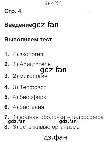 Проверка домашнего задания всегда занимает большое количество времени. На помощь приходит ГДЗ фан по Биологии пятого класса. Здесь собраны популярные ответы на 4 (Введение. Выполняем тест № 1, 2, 3, 4, 5, 6, 7, 8) Биология 5-6 класс тетрадь-тренажер Сухорукова Л.Н.