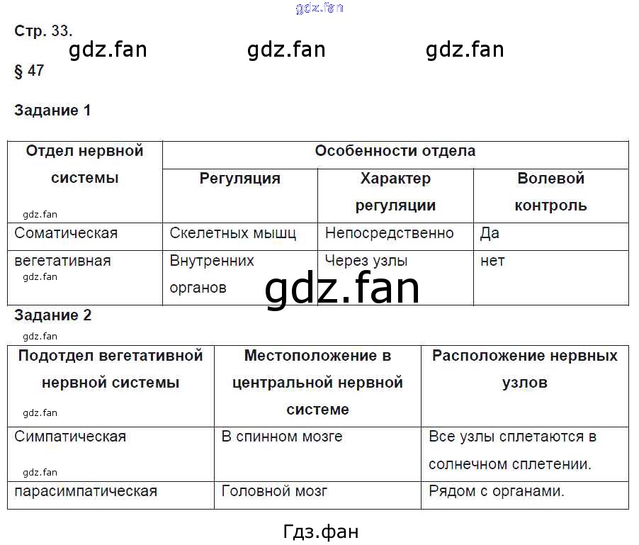 Проверка домашнего задания всегда занимает большое количество времени. На помощь приходит ГДЗ фан по Биологии восьмого класса. Здесь собраны популярные ответы на 33 (§47. Автономный (вегетативный) отдел нервной системы № 1, 2) Биология 8 класс рабочая тетрадь Маш Р.Д.