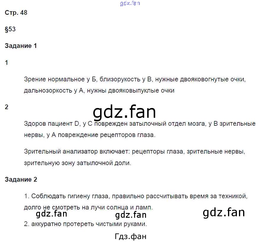 Проверка домашнего задания всегда занимает большое количество времени. На помощь приходит ГДЗ фан по Биологии восьмого класса. Здесь собраны популярные ответы на 48 (§53. Заболевания и повреждения глаз № 1, 2) Биология 8 класс рабочая тетрадь Маш Р.Д.