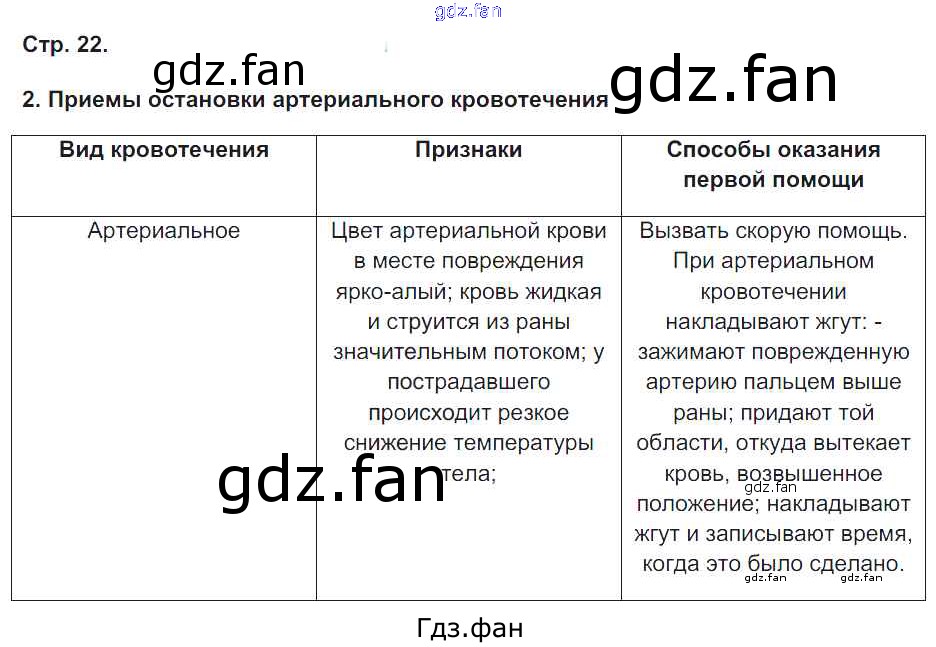 Проверка домашнего задания всегда занимает большое количество времени. На помощь приходит ГДЗ фан по Биологии восьмого класса. Здесь собраны популярные ответы на 22 (Приёмы остановки артериального кровотечения) Биология 8 класс тетрадь-практикум Сухорукова Л.Н.
