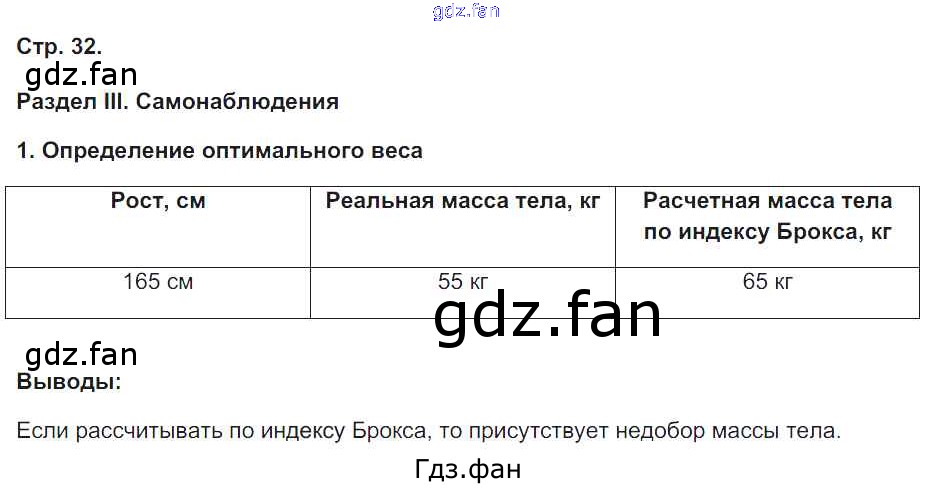 Проверка домашнего задания всегда занимает большое количество времени. На помощь приходит ГДЗ фан по Биологии восьмого класса. Здесь собраны популярные ответы на 32 (Самонаблюдения. Определение оптимального веса) Биология 8 класс тетрадь-практикум Сухорукова Л.Н.