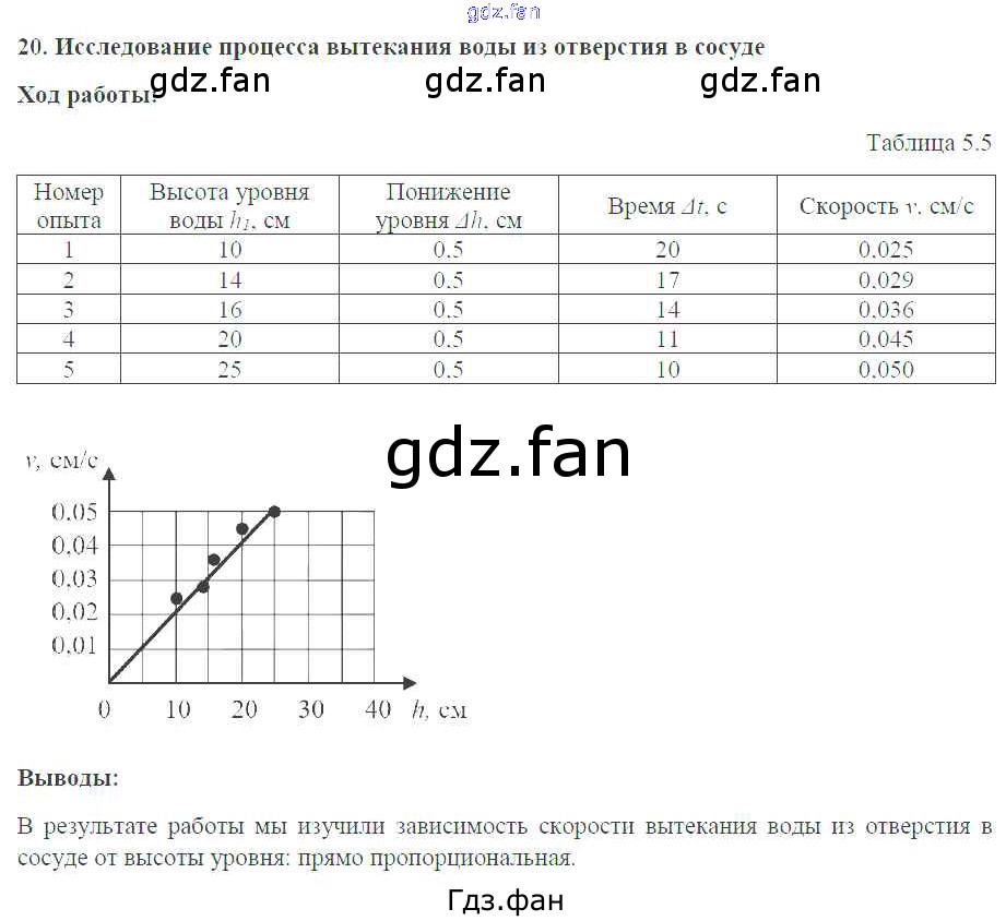 Проверка домашнего задания всегда занимает большое количество времени. На помощь приходит ГДЗ фан по Физике седьмого класса. Здесь собраны популярные ответы на №20. Исследование процесса вытекания воды из отверстия в сосуде (стр. 52-53) Физика 7 класс тетрадь-практикум Белага В.В.
