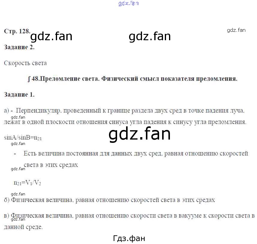 Проверка домашнего задания всегда занимает большое количество времени. На помощь приходит ГДЗ фан по Физике девятого класса. Здесь собраны популярные ответы на 128 (№ 2.§48. Преломление света. Физический смысл показателя преломления № 1) Физика 9 класс рабочая тетрадь Перышкин А.В. (к уч. Перышкина А.В.)