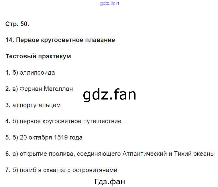 Проверка домашнего задания всегда занимает большое количество времени. На помощь приходит ГДЗ фан по Географии пятого класса. Здесь собраны популярные ответы на 50 (§14. Первое кругосветное путешествие. Тестовый практикум № 1, 2, 3, 4, 5, 6, 7) География 5 класс тетрадь-практикум Молодцов Д.В. ( к уч. Домогацких Е.М.)