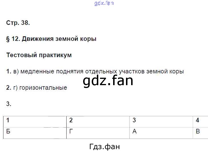 Проверка домашнего задания всегда занимает большое количество времени. На помощь приходит ГДЗ фан по Географии шестого класса. Здесь собраны популярные ответы на 38 (§12. Движения земной коры. Тестовый практикум № 1, 2, 3) География 6 класс тетрадь-практикум Болотникова Н.В. (к уч. Домогацких)