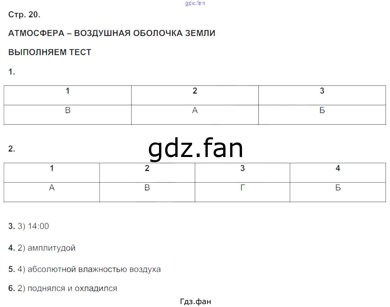 Проверка домашнего задания всегда занимает большое количество времени. На помощь приходит ГДЗ фан по Географии пятого класса. Здесь собраны популярные ответы на 20 (Атмосфера - воздушная оболочка Земли. Выполняем тест № 1, 2, 3, 4, 5, 6) География 5-6 класс тетрадь-тренажёр Лобжанидзе А.А.