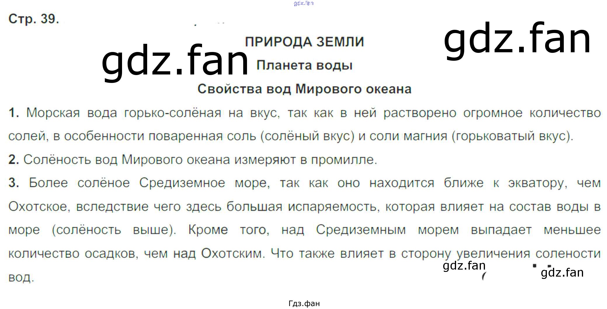 Проверка домашнего задания всегда занимает большое количество времени. На помощь приходит ГДЗ фан по Географии шестого класса. Здесь собраны популярные ответы на 39 (Планета воды Свойства вод Мирового океана № 1, 2, 3) География 6 класс рабочая тетрадь Румянцев А.В. (к уч. Климановой)