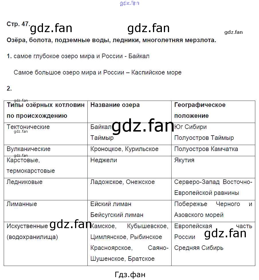 Проверка домашнего задания всегда занимает большое количество времени. На помощь приходит ГДЗ фан по Географии восьмого класса. Здесь собраны популярные ответы на 47 (Озёра, болота, подземные воды, ледники, многолетняя мерзлота № 1, 2) География 8 класс рабочая тетрадь География России Баринова И.И.