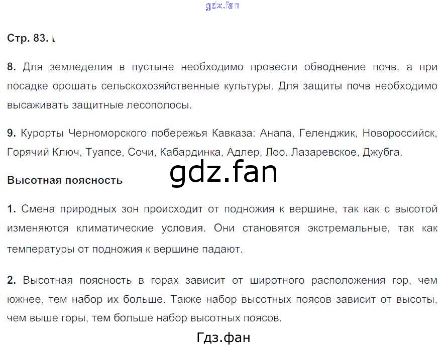 Проверка домашнего задания всегда занимает большое количество времени. На помощь приходит ГДЗ фан по Географии восьмого класса. Здесь собраны популярные ответы на 83 (№ 8, 9. Высотная поясность № 1, 2) География 8 класс рабочая тетрадь Природа Баринова И.И.