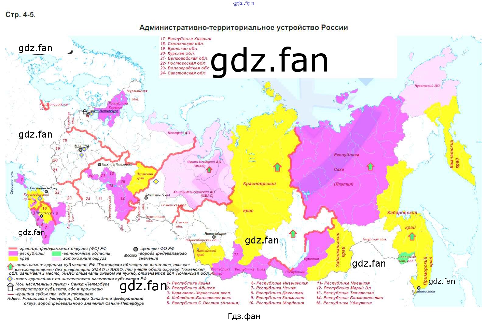 Проверка домашнего задания всегда занимает большое количество времени. На помощь приходит ГДЗ фан по Географии восьмого класса. Здесь собраны популярные ответы на 4-5 (административно-территориальное устройство РФ) География 8 класс контурные карты Котляр О.