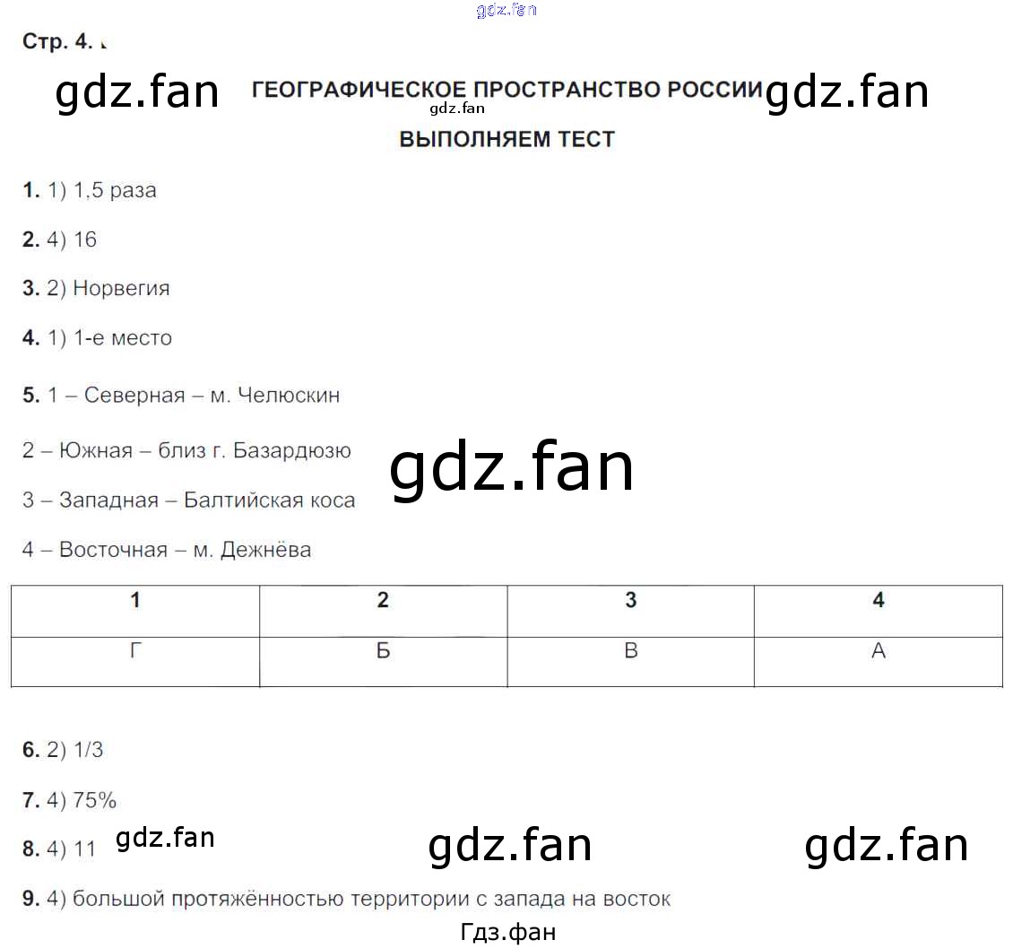 Проверка домашнего задания всегда занимает большое количество времени. На помощь приходит ГДЗ фан по Географии восьмого класса. Здесь собраны популярные ответы на 4 (Географическое пространство России. Выполняем тест № 1, 2, 3, 4, 5, 6, 7, 8, 9) География 8 класс тетрадь-тренажёр Ольховая Н.В.