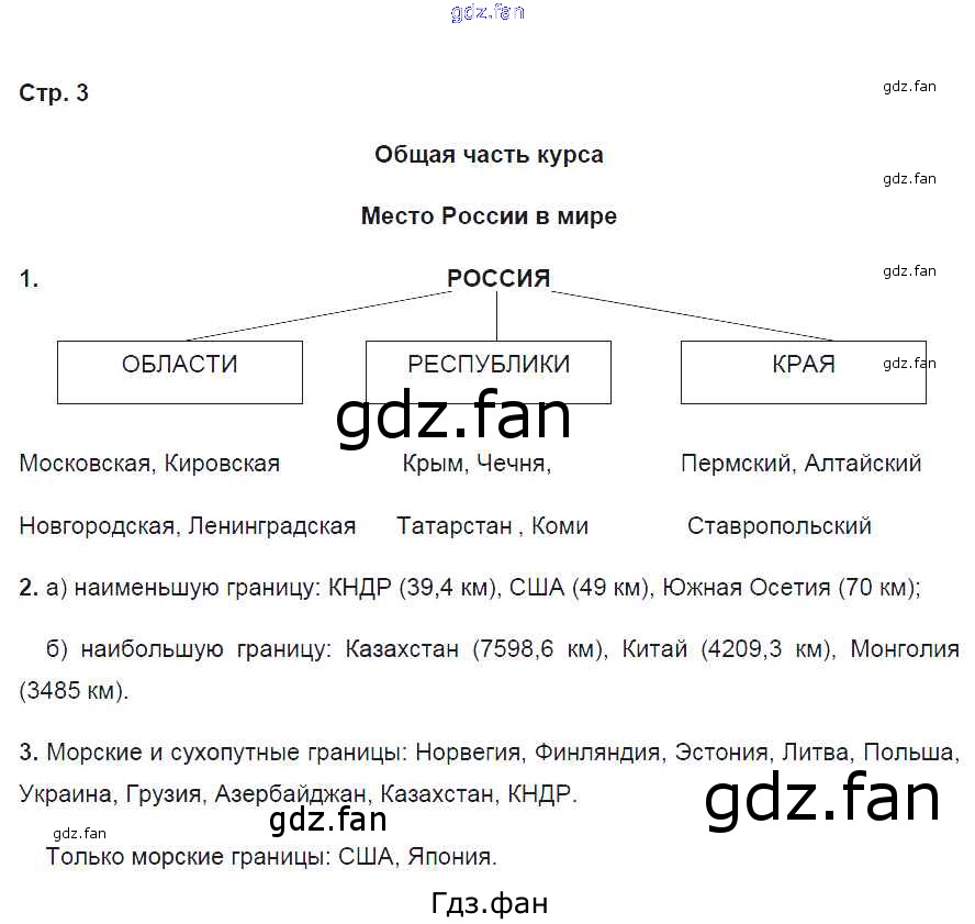 Проверка домашнего задания всегда занимает большое количество времени. На помощь приходит ГДЗ фан по Географии девятого класса. Здесь собраны популярные ответы на 3 (Место России в мире № 1, 2, 3) География России. Население и хозяйство 9 класс рабочая тетрадь Дронов В.П. (к уч.Дронова)