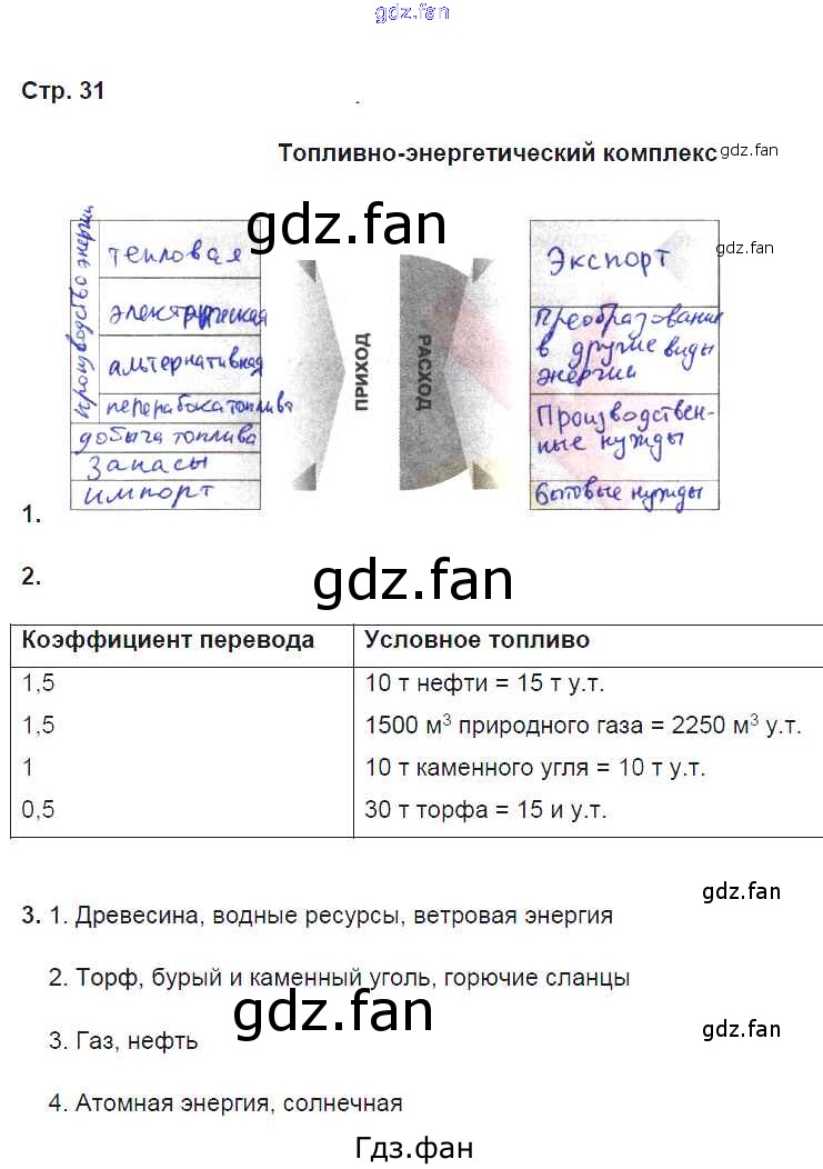 Проверка домашнего задания всегда занимает большое количество времени. На помощь приходит ГДЗ фан по Географии девятого класса. Здесь собраны популярные ответы на 31 (Топливно-энергетический комплекс № 1, 2, 3) География России. Население и хозяйство 9 класс рабочая тетрадь Дронов В.П. (к уч.Дронова)