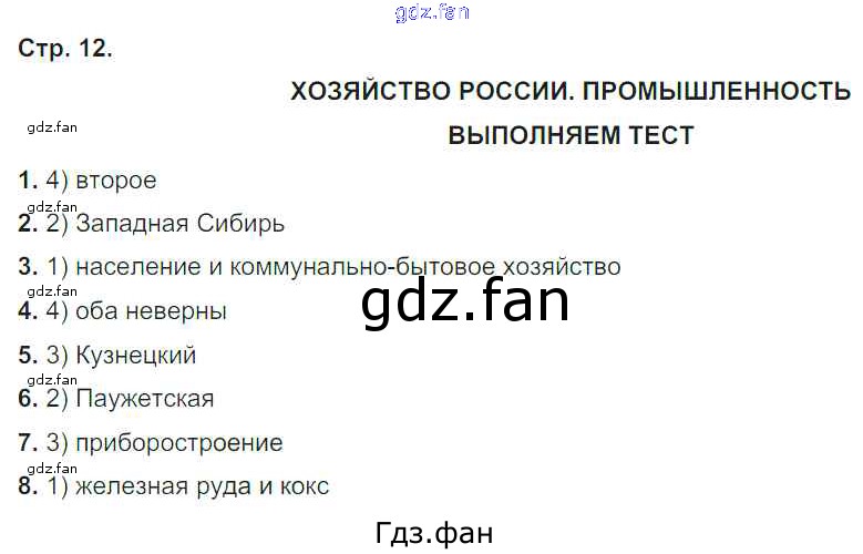 Проверка домашнего задания всегда занимает большое количество времени. На помощь приходит ГДЗ фан по Географии девятого класса. Здесь собраны популярные ответы на 12 (Промышленность. Выполняем тест № 1, 2, 3, 4, 5, 6, 7, 8) География России 9 класс тетрадь-тренажер Ходова Е.С.