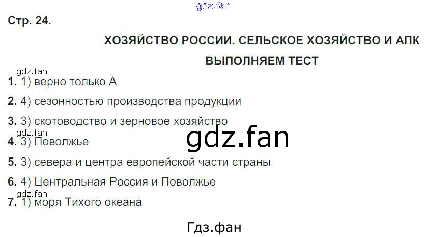 Проверка домашнего задания всегда занимает большое количество времени. На помощь приходит ГДЗ фан по Географии девятого класса. Здесь собраны популярные ответы на 24 (Сельское хозяйство и АПК. Выполняем тест № 1, 2, 3, 4, 5, 6, 7) География России 9 класс тетрадь-тренажер Ходова Е.С.