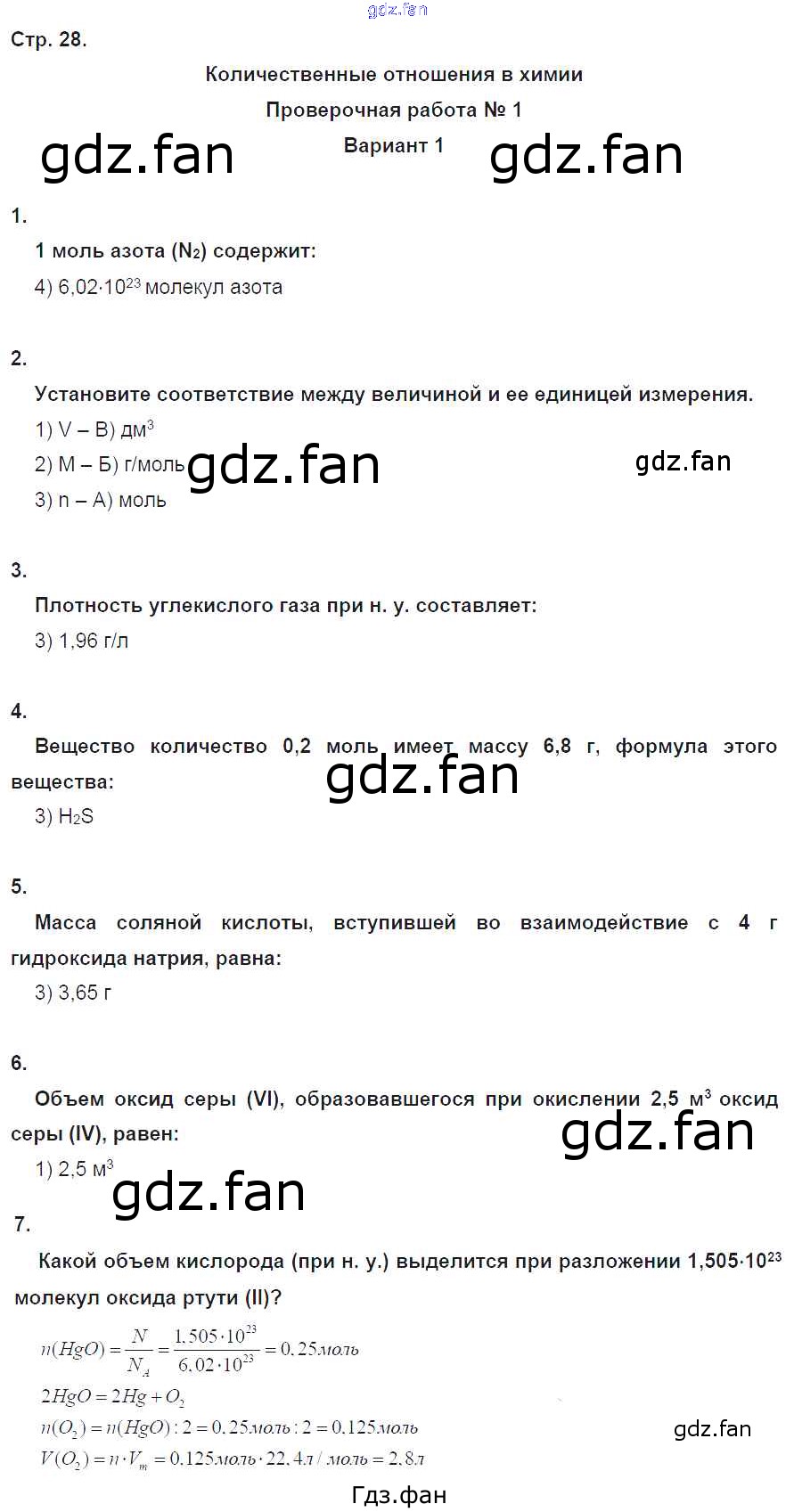 Проверка домашнего задания всегда занимает большое количество времени. На помощь приходит ГДЗ фан по Химии восьмого класса. Здесь собраны популярные ответы на 28 (Количественные отношения в химии. Проверочная работа 1. Вариант 1 № 1, 2, 3, 4, 5, 6, 7) Химия 8 класс тетрадь-экзаменатор Бобылёва О.Л.
