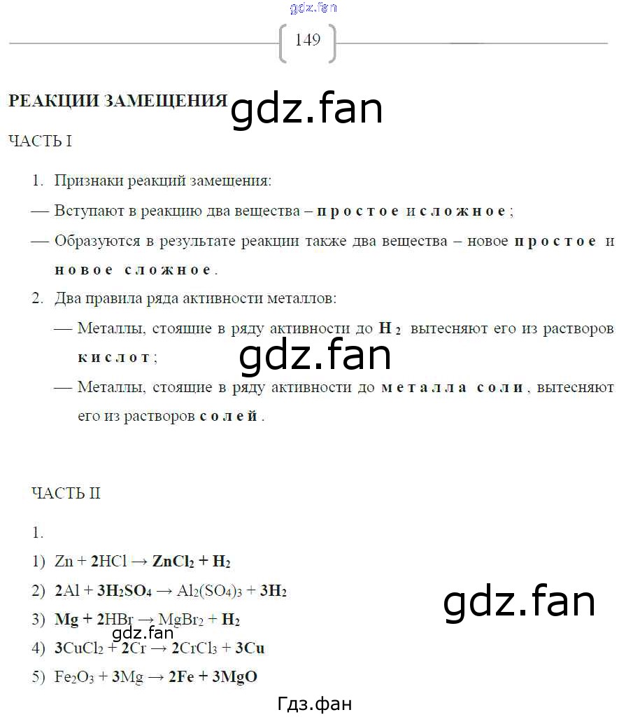 Проверка домашнего задания всегда занимает большое количество времени. На помощь приходит ГДЗ фан по Химии восьмого класса. Здесь собраны популярные ответы на 149 (Реакции замещения. Часть 1 № 1, 2. Часть 2 № 1) Химия 8 класс рабочая тетрадь Габриелян О.С.