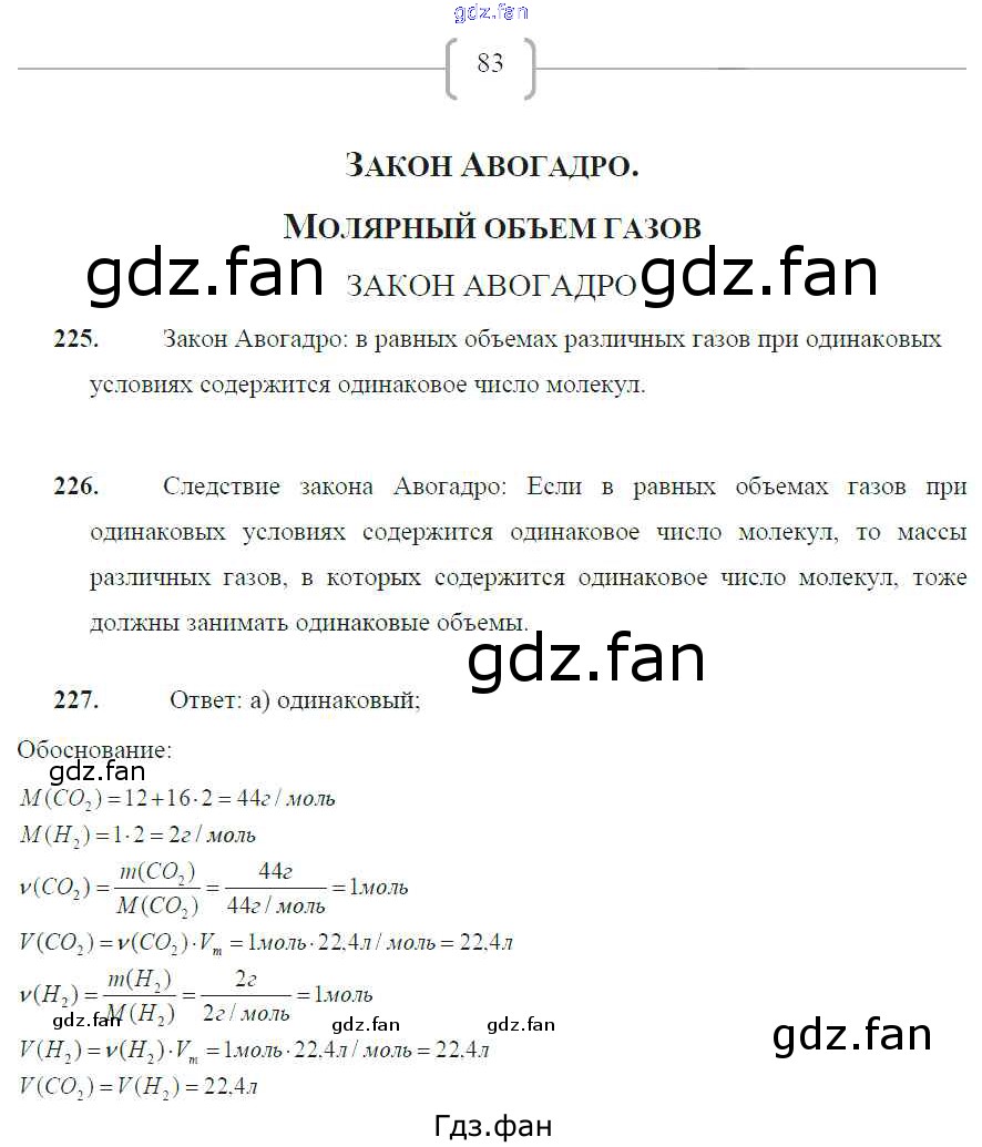 Проверка домашнего задания всегда занимает большое количество времени. На помощь приходит ГДЗ фан по Химии восьмого класса. Здесь собраны популярные ответы на 83 (Закон Авогадро. Молярный объём газов № 225, 226, 227) Химия 8 класс рабочая тетрадь Габрусева Н.И.