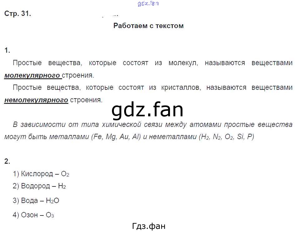 Проверка домашнего задания всегда занимает большое количество времени. На помощь приходит ГДЗ фан по Химии восьмого класса. Здесь собраны популярные ответы на 31 (Работаем с текстом № 1, 2) Химия 8 класс тетрадь-тренажёр Гара Н.Н.