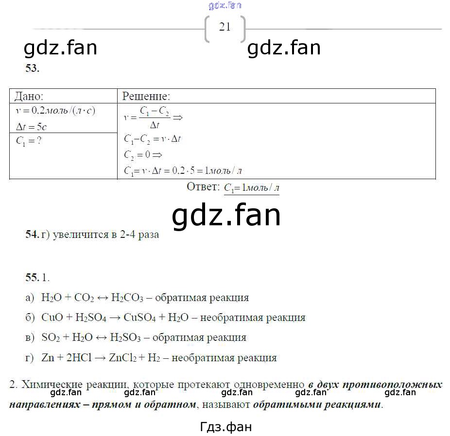 Проверка домашнего задания всегда занимает большое количество времени. На помощь приходит ГДЗ фан по Химии девятого класса. Здесь собраны популярные ответы на 21 (№ 53, 54, 55) Химия 9 класс рабочая тетрадь Габрусева Н.И.