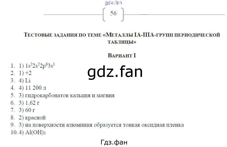 Проверка домашнего задания всегда занимает большое количество времени. На помощь приходит ГДЗ фан по Химии девятого класса. Здесь собраны популярные ответы на 56 (Тестовые задания по теме «Металлы IA — IIIA-групп периодической таблицы» Вариант 1 № 1-10) Химия 9 класс рабочая тетрадь Габрусева Н.И.