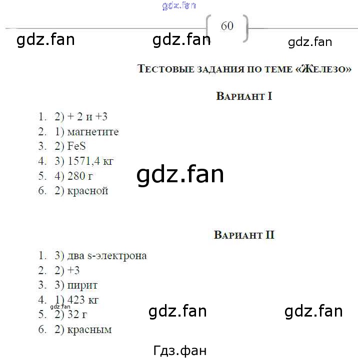 Проверка домашнего задания всегда занимает большое количество времени. На помощь приходит ГДЗ фан по Химии девятого класса. Здесь собраны популярные ответы на 60 (Тестовые задания по теме «Железо» Вариант 1 № 1-6) Химия 9 класс рабочая тетрадь Габрусева Н.И.