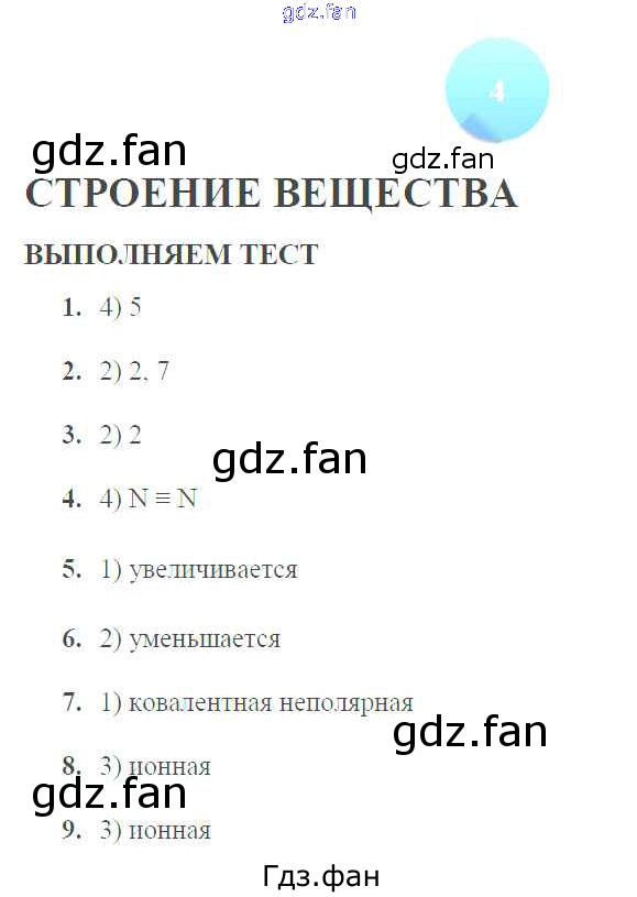 Проверка домашнего задания всегда занимает большое количество времени. На помощь приходит ГДЗ фан по Химии девятого класса. Здесь собраны популярные ответы на 4 (Строение вещества. Выполняем тест № 1, 2, 3, 4, 5, 6, 7, 8, 9) Химия 9 класс тетрадь-тренажер Гара Н.Н.