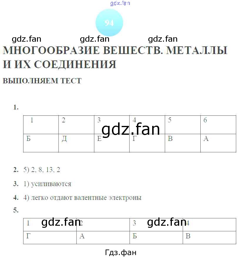Проверка домашнего задания всегда занимает большое количество времени. На помощь приходит ГДЗ фан по Химии девятого класса. Здесь собраны популярные ответы на 94 (Многообразие веществ. Металлы и их соединения. Выполняем тест № 1, 2, 3, 4, 5) Химия 9 класс тетрадь-тренажер Гара Н.Н.
